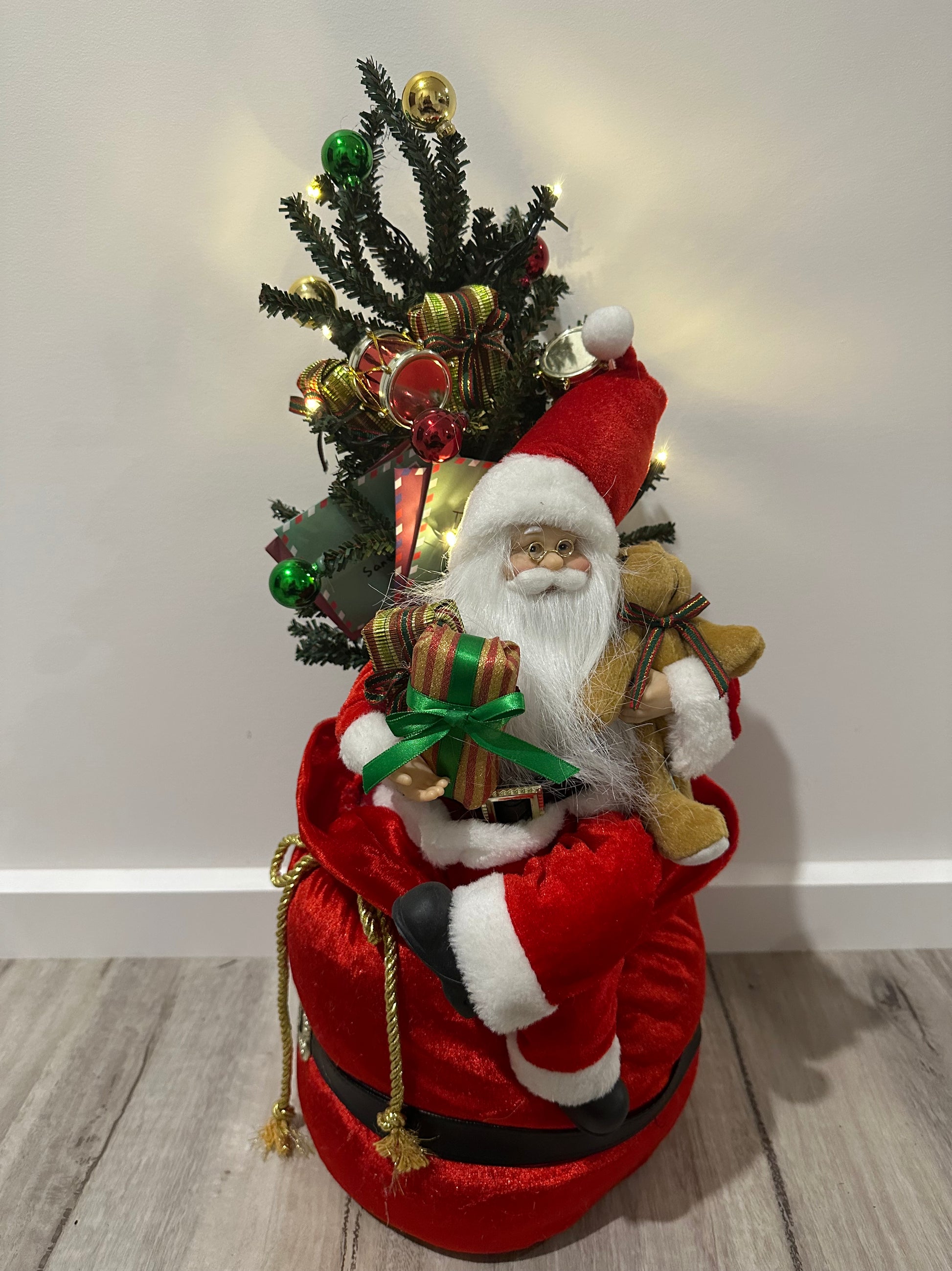 Santa is sure to bring you joy sitting on top of this gorgeous sack. His Christmas tree is covered in beautiful little shiny baubles and lights. A teddy bear and letters to Santa to finish it off nicely.